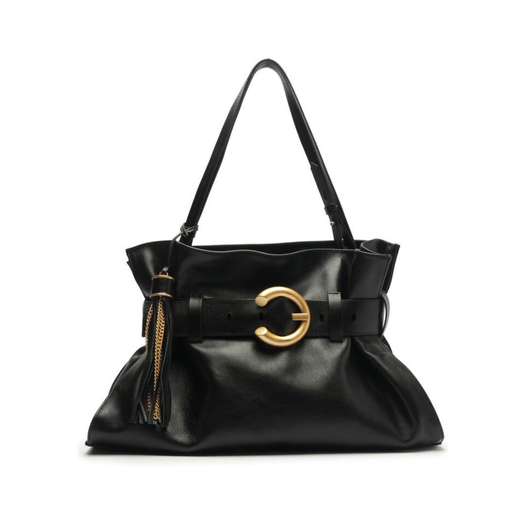 Descrição: Bolsa tiracolo média de couro preta. O acessório tem formato macio e retangular e tira larga aplicada nas capas, estilo cinto, com passadores e fivela metálica, dourada e em forma de argola. Traz alça tiracolo, fecho superior em zíper e puxador. Com bag charm de barbicacho.