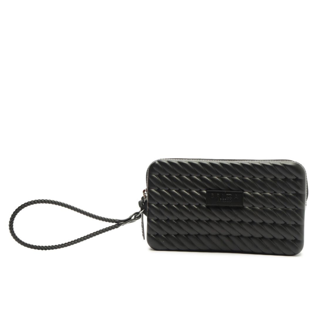 Descrição: Bolsa clutch feminina preta em plástico injetado fosco. O acessório tem formato quadrado, compacto e capas texturizadas, além de faixa lisa com gravação discreta do nome da marca na capa frontal. Traz fecho superior em zíper e puxador emborrachado com inscrição em alto-relevo do nome da marca.