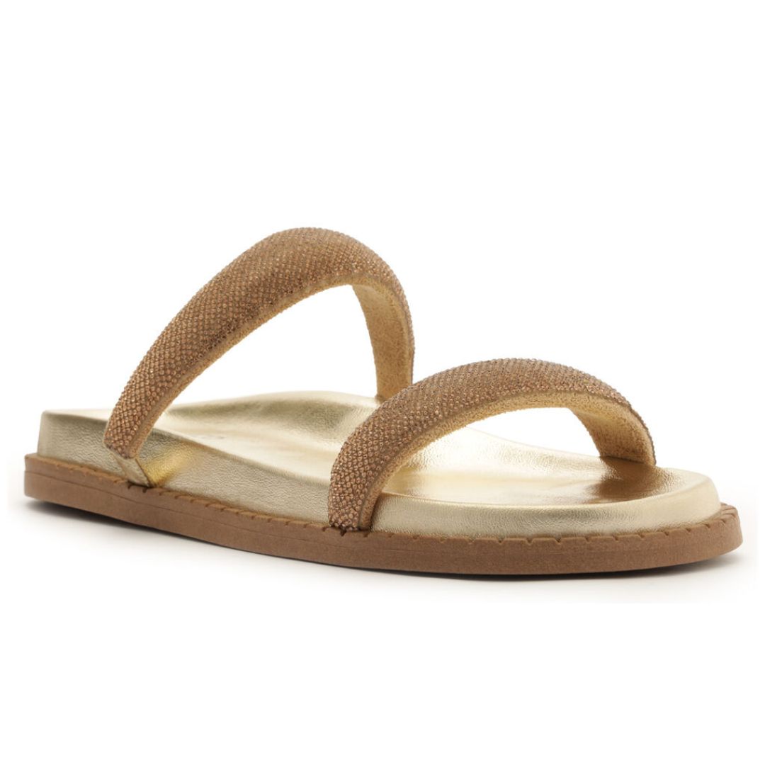 Descrição: Sandália rasteira feminina dourada. O sapato tem salto rasteiro, palmilha com formato anatômico e inscrição do nome da marca. Possui solado flatform, base emborrachada e formato arredondado na ponta. Traz duas tiras com aplicação de cristais sobre os dedos e a parte superior do pé. Deixa todo o pé à mostra.