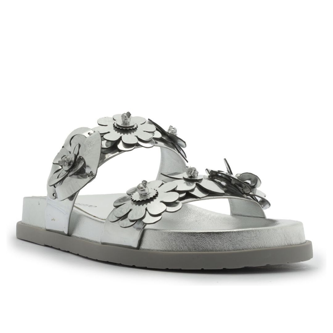 A sandália tem aplicação de flores, traduzindo as tendências da temporada, e é opção certeira para inserir um toque charmoso e delicado nas produções. Para usar do office ao passeio.