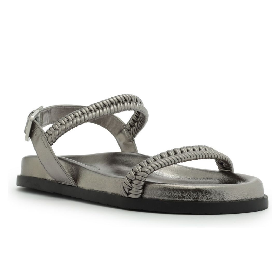 Descrição: Sandália papete prata. O modelo tem salto rasteiro, palmilha com formato anatômico e inscrição do nome da marca. Possui solado flatform, base emborrachada preta e bico redondo. Traz tiras largas tramadas sobre os dedos e o peito do pé. Com tira média em torno do calcanhar e fecho em fivela quadrada lateral, deixa todo o pé à mostra.