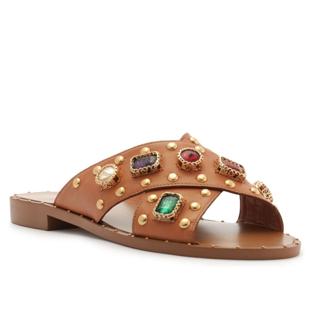 Arezzo Rasteira Marrom Nut Couro Tiras Cruzadas Pedrarias