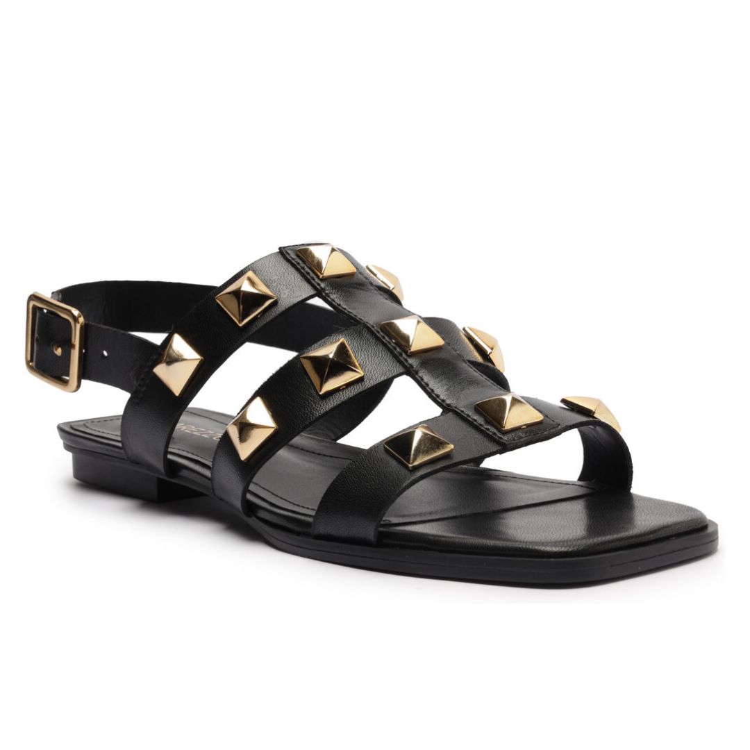 Descrição: Sandália preta de couro. O modelo tem salto rasteiro e bico quadrado. Traz tiras grossas, sobre os dedos e o peito do pé, sendo uma central e três horizontais, conectadas e com aplicação de tachas metálicas. Possui ainda tira em torno do tornozelo, fechando em fivela lateral. Com palmilha da cor da sandália e nome da marca.