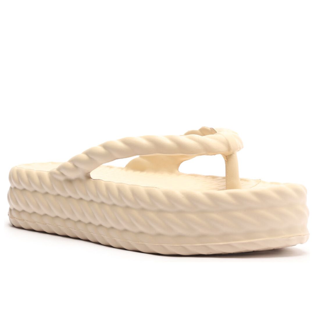 Descrição: Sandália branca em EVA. O modelo tem salto baixo, solado flatform em relevo que imita tiras de cordão torcido e palmilha texturizada com nome da marca. De bico redondo, traz tiras dividindo os dedos e também em forma de cordão torcido. Aberta, exibe todo o pé.