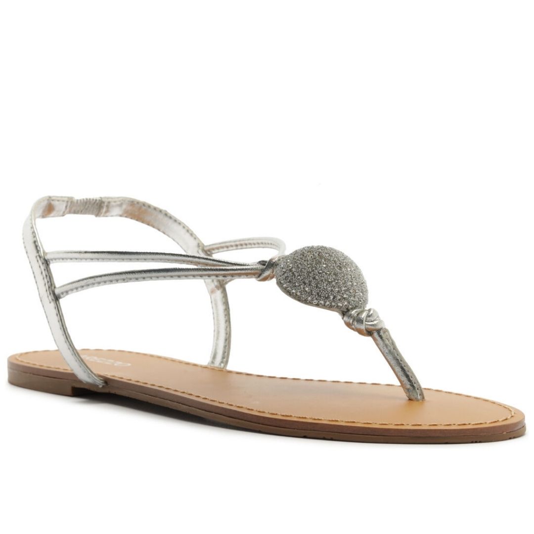Descrição: Sandália rasteira feminina prateada. O sapato tem sola flat e formato arredondado na ponta. Traz tira fina que passa entre os dedos, com aplicação de peça redonda com cristais, conectada a mais uma tira fina dupla na horizontal. Possui ainda tira fina em torno do calcanhar, com elástico e conectada à tira frontal. Com palmilha marrom lisa e inscrição do nome da marca. Aberta, exibe todo o pé. alça: 18 cm | Largura da alça: 1,8 cm