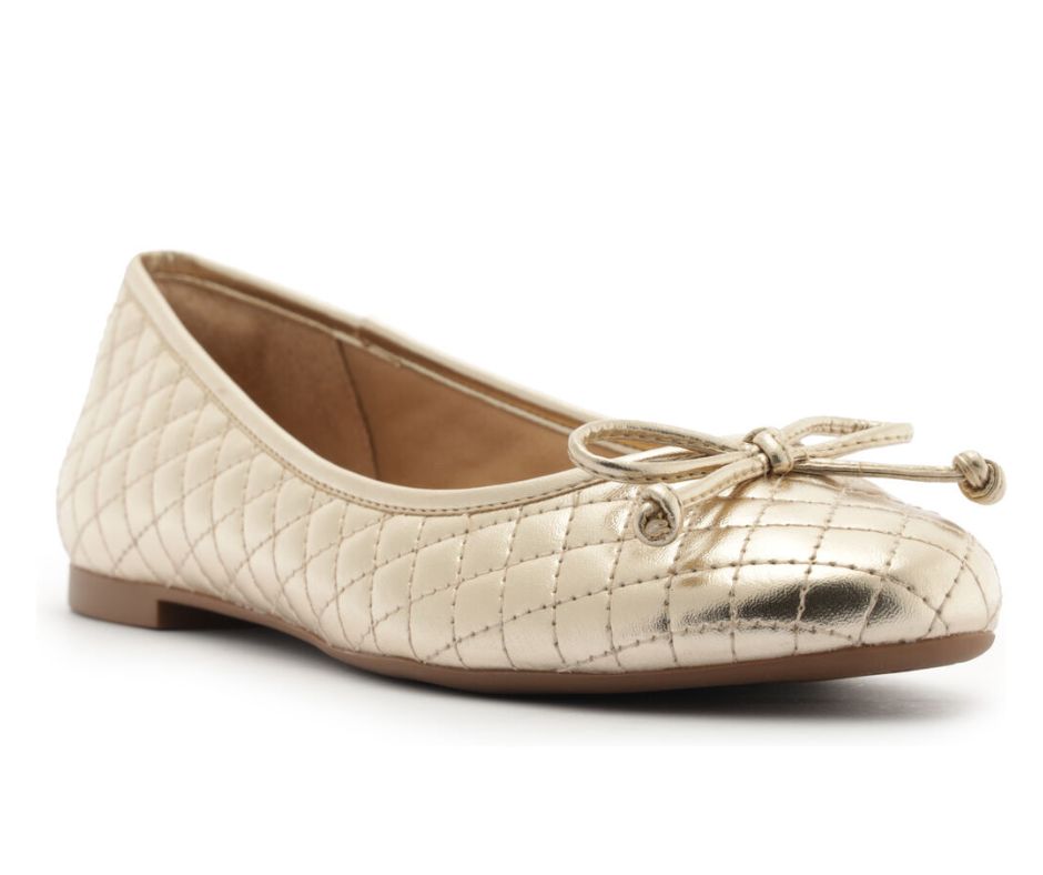 Descrição: Sapatilha dourada. O modelo tem salto rasteiro e bico redondo. Traz cabedal em matelassê e recorte arredondado sobre o peito do pé. Fechada, possui ainda aplicação de laço pequeno no cabedal. Com palmilha da cor do modelo e inscrição do nome da marca, a sapatilha exibe todo o peito do pé.