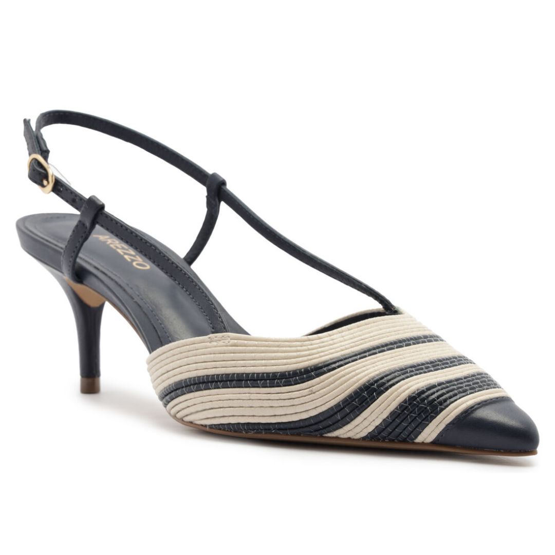 O scarpin de ponta fina surge com tira slingback, tom neutro e pegada navy, traduzindo as tendências da temporada. Perfeito para o dia a dia, é garantia de produções elegantes e confortáveis.