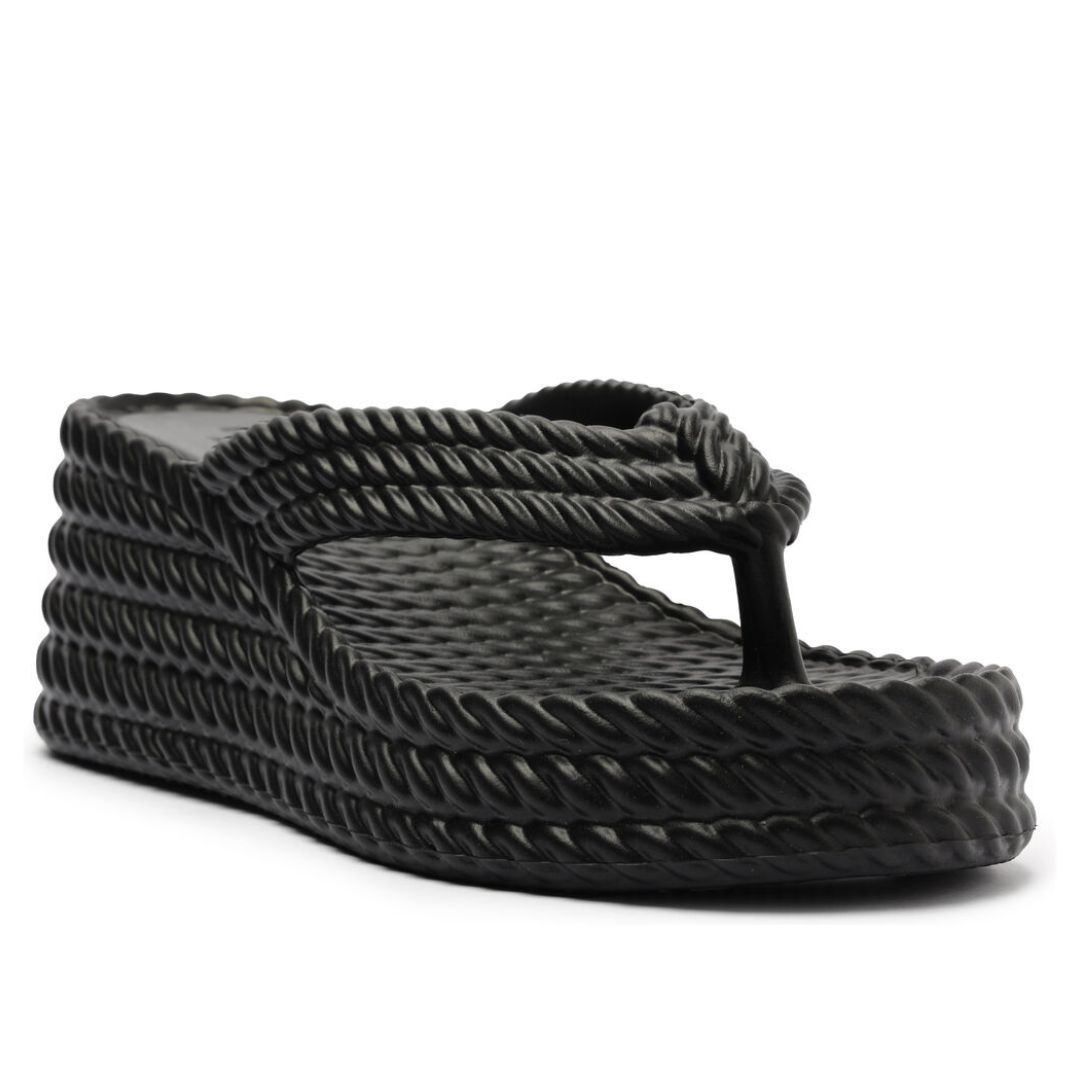 Descrição: Sandália preta. O sapato tem salto médio, palmilha texturizada em EVA e inscrição do nome da marca. Possui solado flatform em PVC e formato arredondado na ponta. Traz tiras largas, dividindo os dedos. Exibe todo o pé.