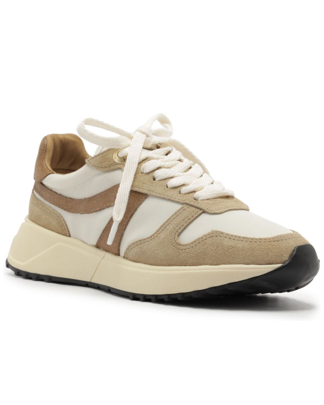 Descrição: Tênis feminino marrom acamurçado. O sapato tem sola média emborrachada, esportiva e bege. Traz cabedal em nylon branco, recortes e aplicações em couro e camurça. Com formato arredondado na ponta, o tênis tem fecho em cadarços brancos e tag do nome da marca na língua. Acompanha cadarço extra marrom.