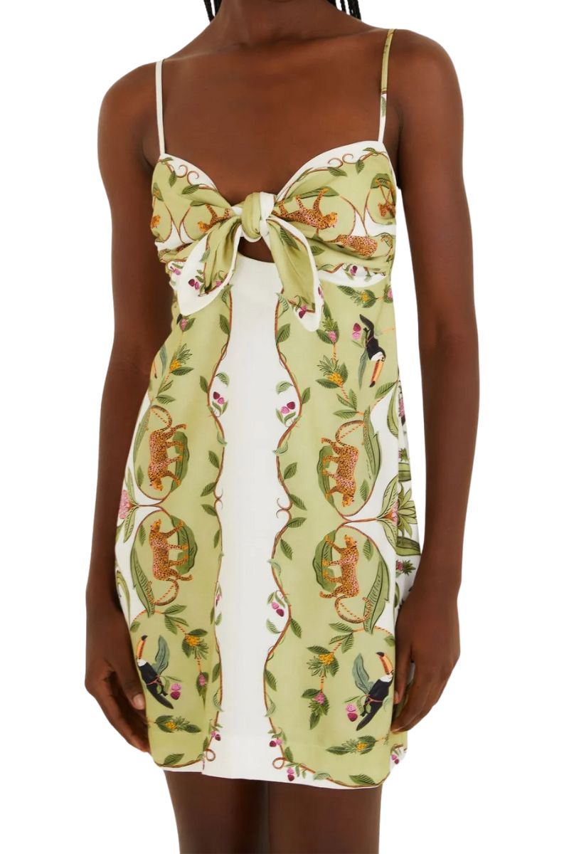 Vestido curto lenço estampado floresta doce. um toque de charme com alças finas e decote em laço que traz delicadeza à peça. um modelo casual que combina leveza e estilo em qualquer ocasião, seja em um passeio ao ar livre ou um encontro descontraído. a originalidade das estampas eleva o seu guarda-roupa. FARM RIO original