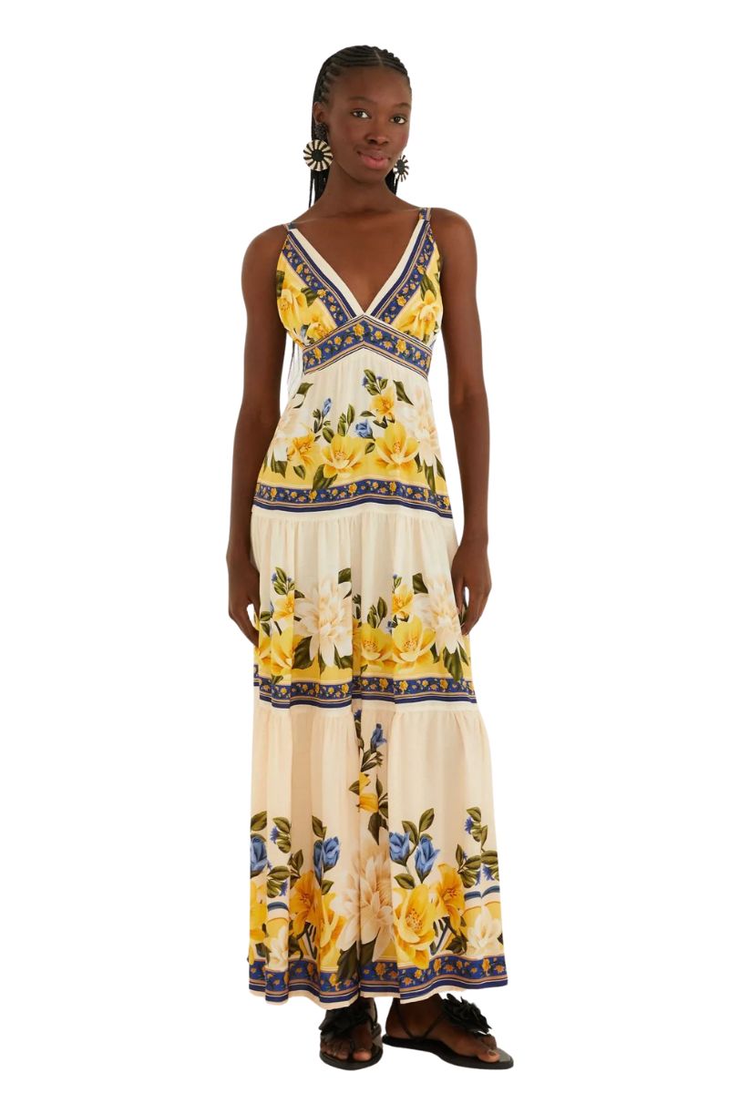 vestido longo estampado flor do rio. possui decote em v e alças finas, proporcionando liberdade e frescor. com babados delicados e cintura levemente ajustada, é ideal para um passeio à beira-mar ou um encontro casual ao pôr do sol. a fluidez do tecido garante conforto e movimento suave