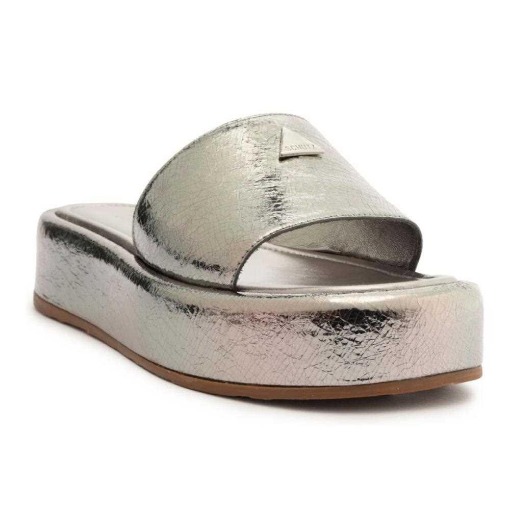 De fácil calce, essa sandália plataforma prata traz a personalidade e conforto do solado elevado junto ao glamour do acabamento metalizado. A aplicação do pequeno Triangle na tira traz um toque extra de sofisticação ao modelo. Aposte!
