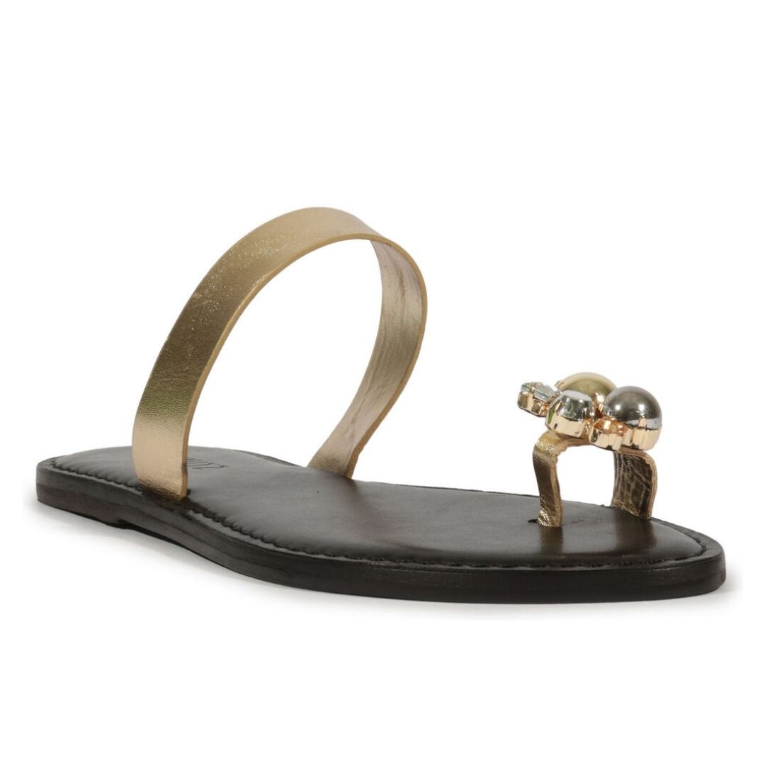 Com um visual super glam e elegante, essa sandália feminina dourada se destaca por seu toe ring com luxuoso enfeite de pedraria. Confortável, ela traz a facilidade do modelo slide - combina praticidade e estilo na medida!